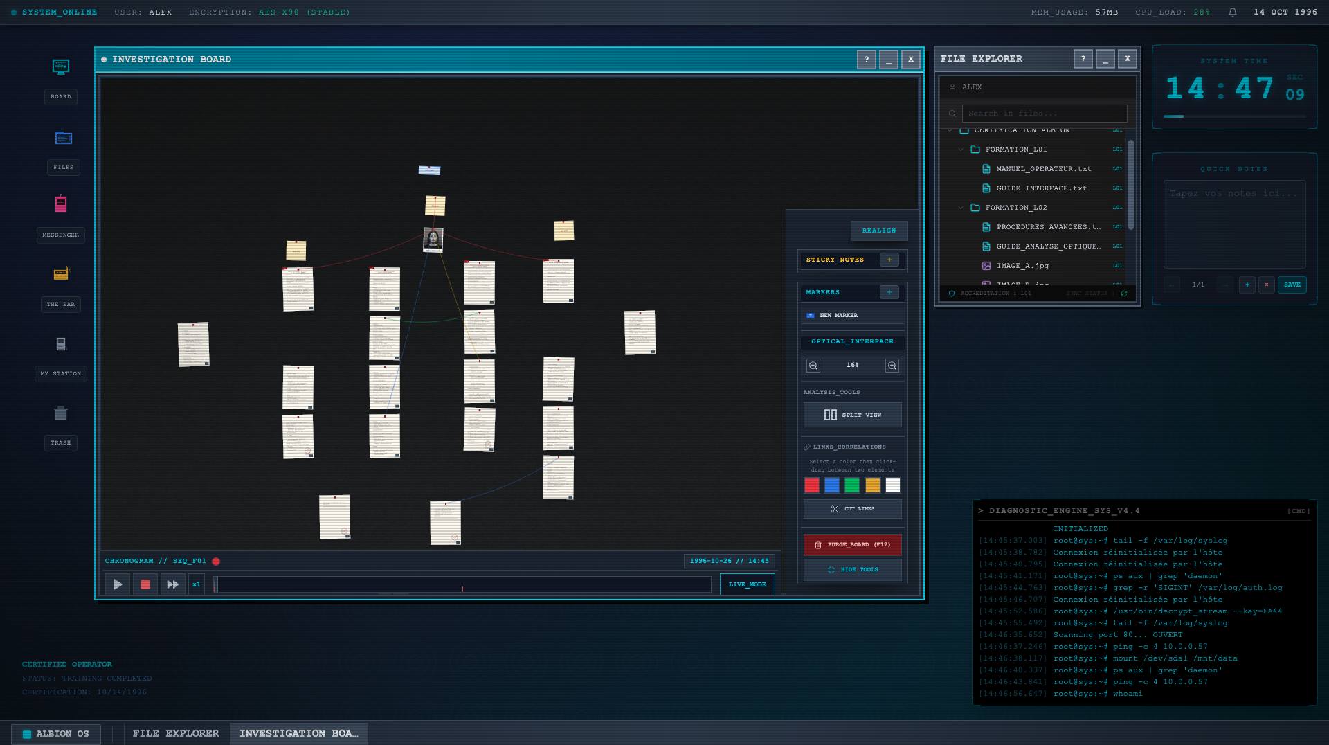 Un OS Authentique Explorez un système d'exploitation complet et fonctionnel inspiré des interfaces gouvernementales de l'époque. Chaque fenêtre, chaque menu, chaque détail a été pensé pour créer une expérience immersive et crédible.